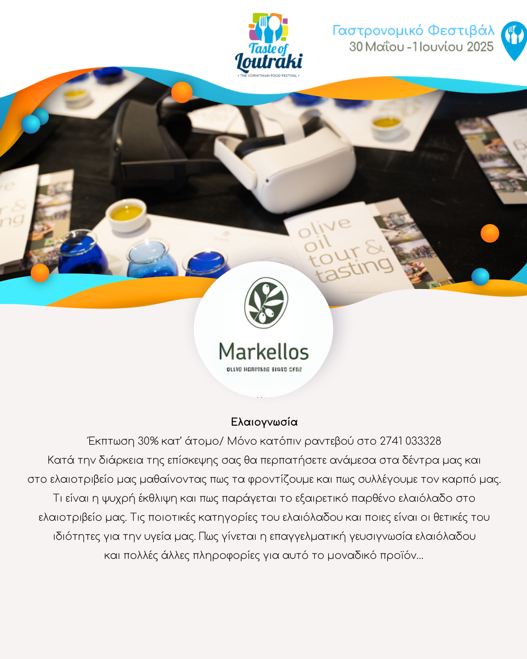 Η Markellos Olive είναι μια οικογενειακή επιχείρηση με ιστορία τεσσάρων γενεών στην καλλιέργεια ελιάς και την παραγωγή εξαιρετικού παρθένου ελαιολάδου, που ξεκίνησε το 1932 από τον Δημήτρη Μάρκελλο. Σήμερα, η τέταρτη γενιά συνεχίζει με πάθος και αφοσίωση, συνδυάζοντας την παράδοση με την καινοτομία. Το 2014, η εταιρεία αναβάθμισε πλήρως τις εγκαταστάσεις της στο Γαλατάκι Κορινθίας, δημιουργώντας ένα σύγχρονο ελαιοτριβείο και μονάδα εμφιάλωσης, και παρουσίασε τη σειρά προϊόντων Soligea, που περιλαμβάνει ελαιόλαδα και προϊόντα ελιάς υψηλής ποιότητας .